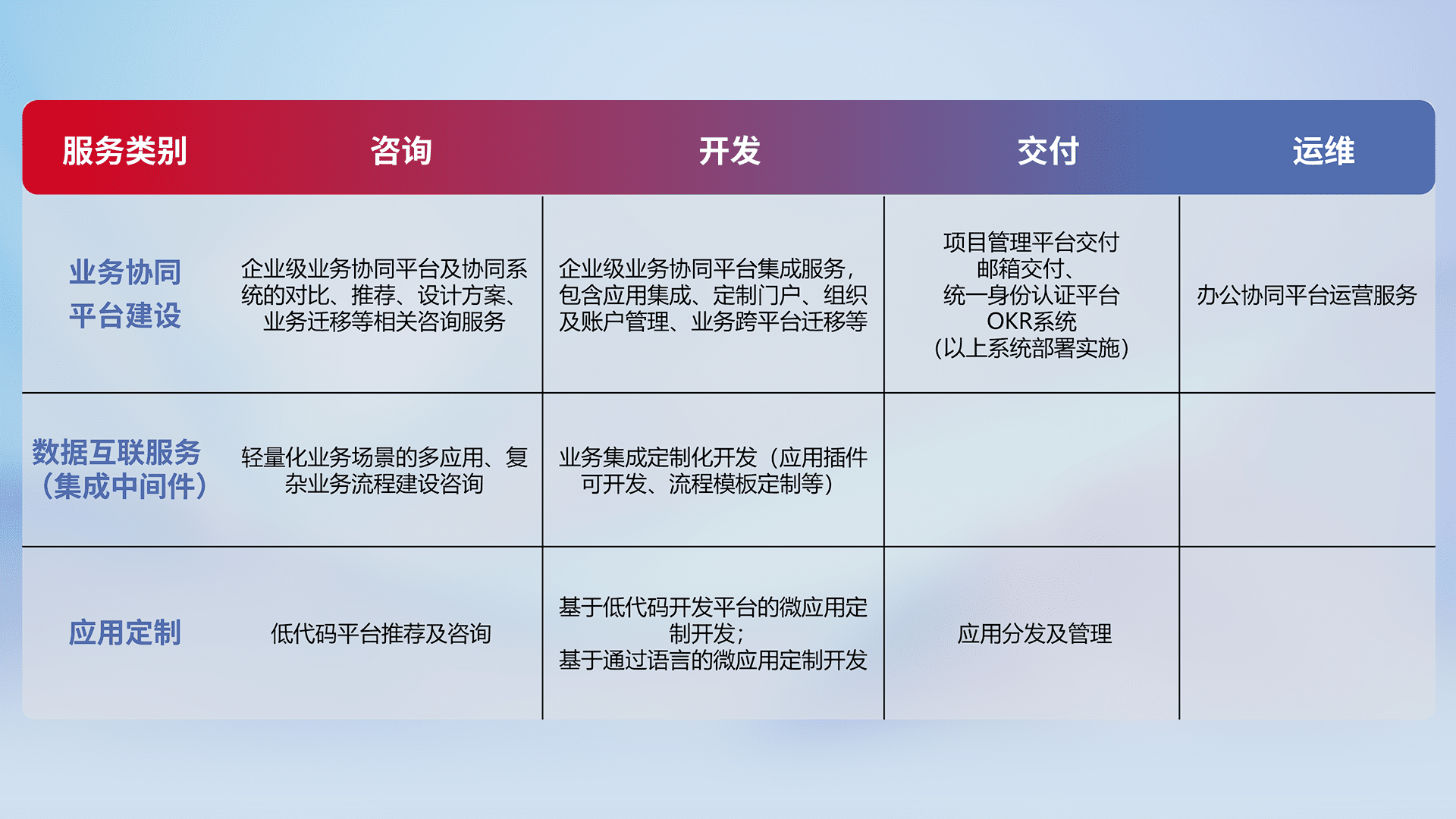 针对钉钉、、、、企微、、、、IDaas等平台级产品提供产品的规划、、、、方案、、、交付、、、定制化开发等服务,,实现如统一协同办公、、、智能客户服务、、、、混合会议管理、、、、智能数据查询、、、、等业务场景,,,实现数字化转型。。。。